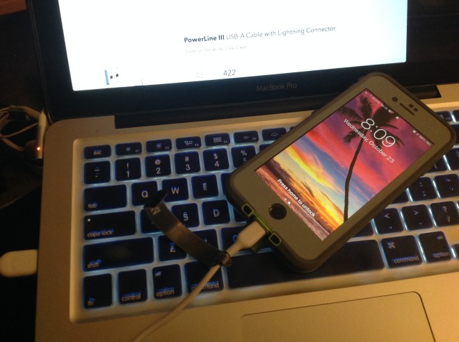 I’d have more pictures but, alas, my use of this Anker Powerline III Lightning cable has been chronically ubiquitous. For starters, the Velcro tie isn’t new to me. It’s something I did on my own with Apple’s OEM cables — all the way back to the extension power cable on my Graphite iBook and dock cable on my 1st Gen iPod touch — to keep them neatly in bags and pockets and car consoles, but then I had to find these ties on my own. I’d trade back every Apple decal they’ve included with their tech just for the hook-and-loop tech of Velcro to keep their cables tidy. So, yet another reason to #UseAnkerInstead over OEM: you’re good to go out of the box.